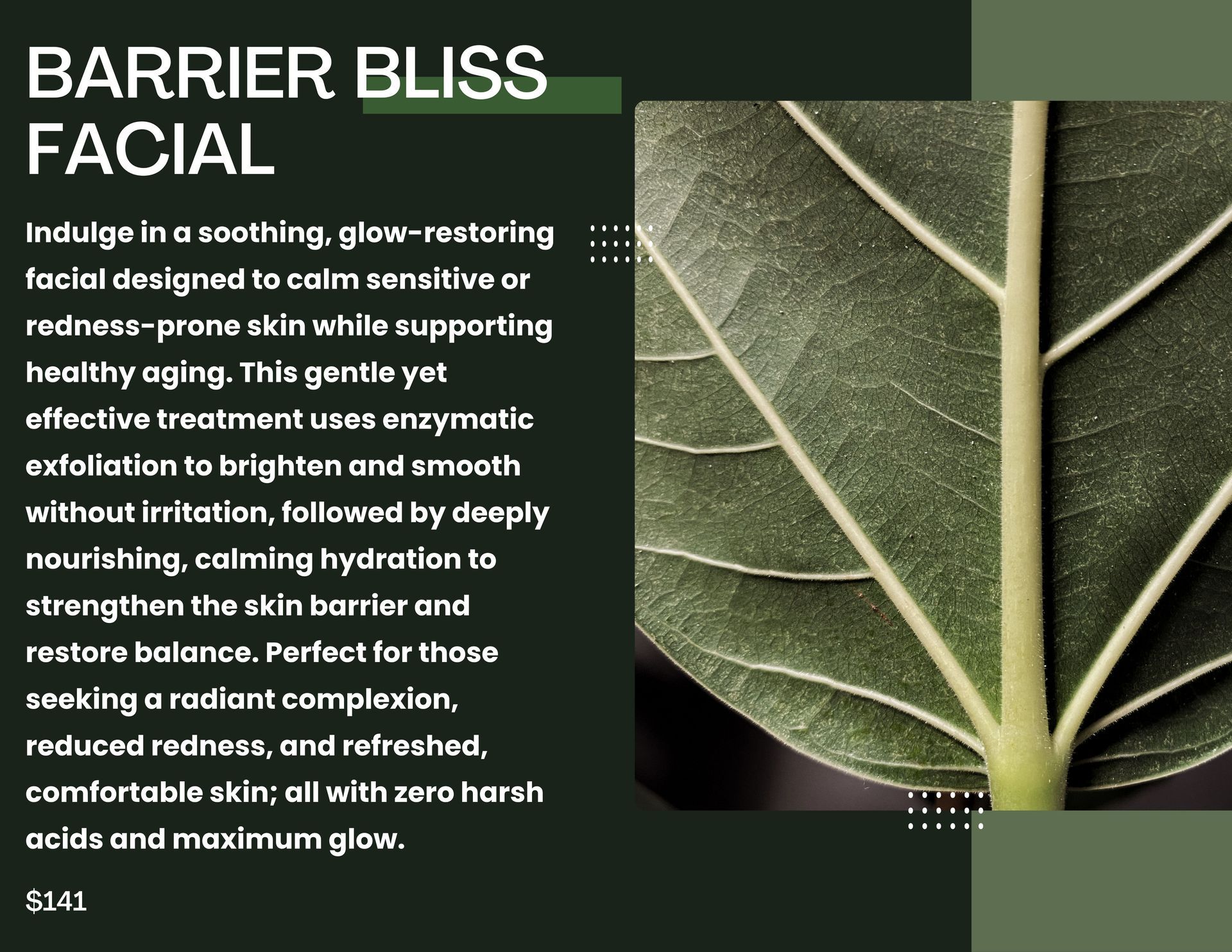 Indulge in a soothing, glow-restoring facial that gently exfoliates, calms redness, and deeply hydrates to support healthy aging and leave sensitive skin balanced, radiant, and refreshed—without harsh acids.